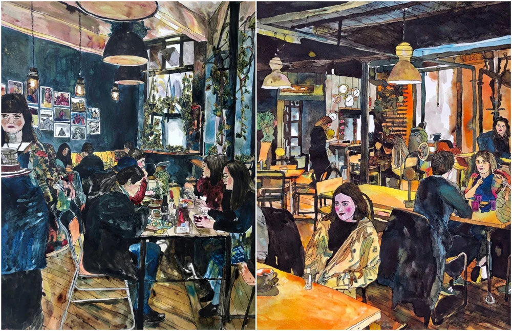 Ωωωω είναι δύσκολο! Πρώτα θα έπρεπε να διαλέξω τον πίνακά μου με το Federal Café στο Manchester που έφτιαξα πέρυσι και έμεινα πολύ ευχαριστημένη από το αποτέλεσμα. Είναι το αγαπημένο μου μέρος για brunch και αυτή τη στιγμή έχω έκθεση με τα έργα μου εκεί. Το δεύτερο πιο αγαπημένο μου έργο είναι το Ezra and Gil, άλλο ένα καφέ στο Manchester. Μου αρέσει να ζωγραφίζω σκηνές όπου συμβαίνουν πολλά πράγματα.