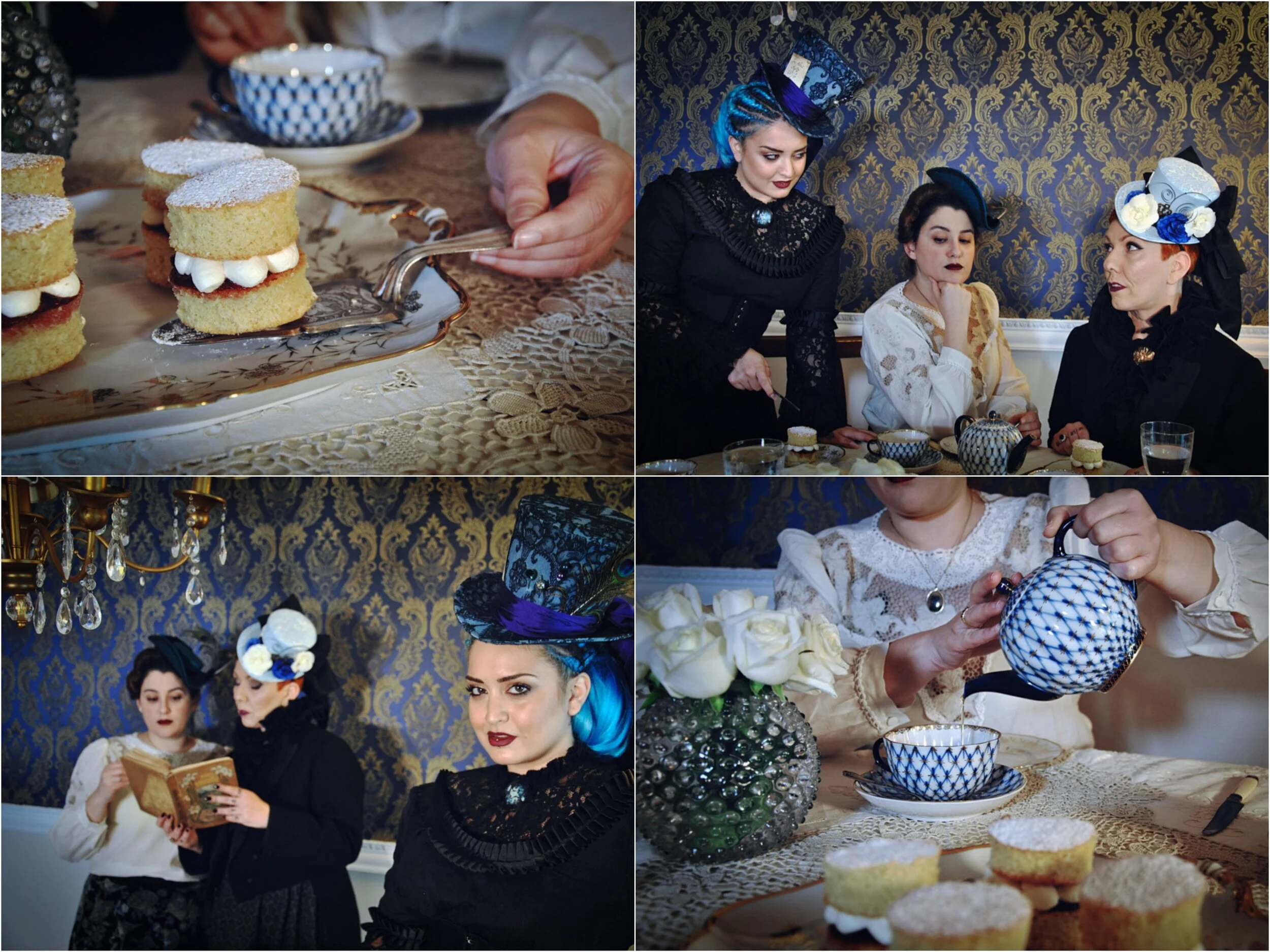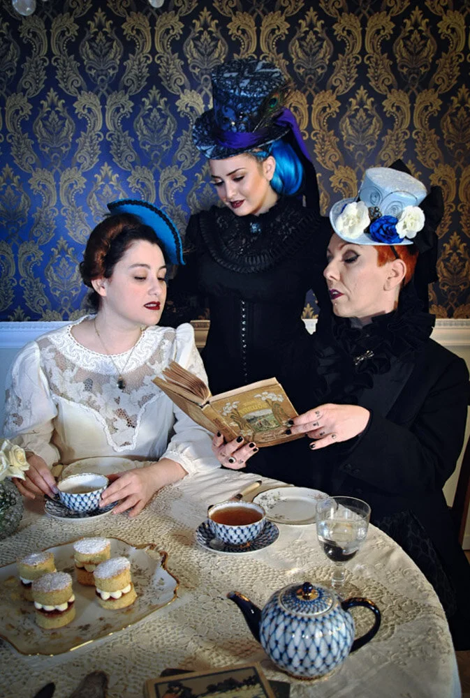 Η λατρεμένη μου La Cocotte, κατά κόσμον Βιβέτα Στρατηγού, σχεδιάστρια ρούχων εποχής και λάτρης του vintage, είχε την ιδέα να αναδημιουργήσουμε παρέα ένα τσάι εμπνευσμένο από τη βικτωριανή εποχή. Εκείνη ανέλαβε το styling μας και εγώ την art de la table και την έρευνα για το σαβουάρ βιβρ. Ο ταλαντούχος φωτογράφος μας, Χρυσόστομος Γαλαθρής, δημιουργός του στούντιο και project The Vintage Room, ανέλαβε να μας απαθανατίσει με τη μοναδική του ματιά, και η Κατερίνα Πεφτίτση, το γνωστό σε όλους vintage μοντέλο από το GNTM με τα απίθανα μπλε μαλλιά και το μοναδικό στυλ, ήρθε να ποζάρει μαζί μας! Το βικτωριανό μας πορτρέτο, βέβαια, δεν θα ήταν ολοκληρωμένο και χωρίς τα μαγικά καπέλα της Λίνας Καραμπλάκα, ή αλλιώς Bizzarre Noir, που κατασκευάζονται εξ’ ολοκλήρου στο χέρι σε μοναδικά σχέδια κατά παραγγελία. Φυσικά, δεν μπορούμε να κάνουμε τα πάντα με την ‘αυθεντικότητα’ που συνήθως μας χαρακτηρίζει στις vintage φωτογραφίσεις μας, οπότε μπορούμε να πούμε πως είναι μια ‘ελεύθερη απόδοση’ του ύφους της εποχής (άλλωστε η βικτωριανή περίοδος διαρκεί 8 δεκαετίες και περιλαμβάνει πολλά διαφορετικά στυλ) ή ίσως μια φωτογράφιση σε στυλ ‘Victoriana’.