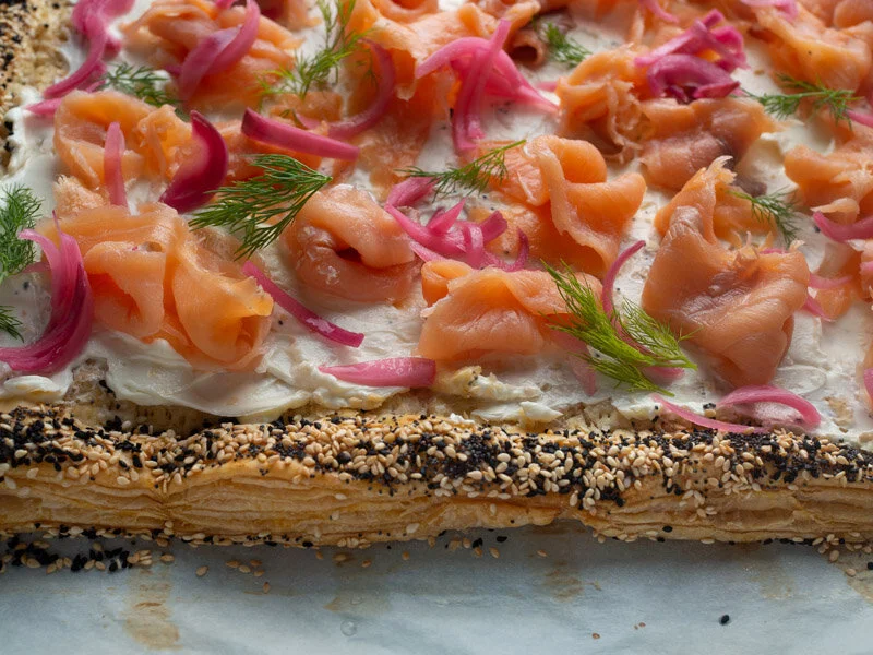 Ελαφριά τάρτα σφολιάτας με καπνιστό σολομό και κρεμμύδια τουρσί