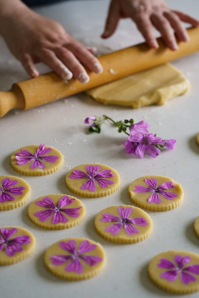 Πίσω στις αγριομολόχες τώρα: η γεύση τους είναι πολύ ενδιαφέρουσα - όπως όλες οι λουλουδογεύσεις, δίνει ένα γήινο και συνάμα αρωματικό αποτέλεσμα όπου την προσθέσεις. Στα μπισκότα αυτά, τα πρόσθεσα κυρίως για αισθητικούς λόγους. Μα δεν είναι πανέμορφα;